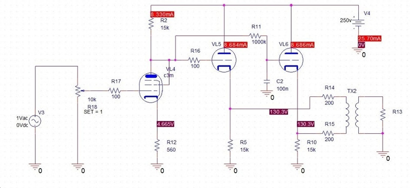 상단진공관만 증폭동작(증폭율은 1이하)을 하고 하단진공관은 아무런 증폭작용을 하지 않으며 상단과 DC전압을 일치시키는 역할만 수행하는 일종의 저항입니다.